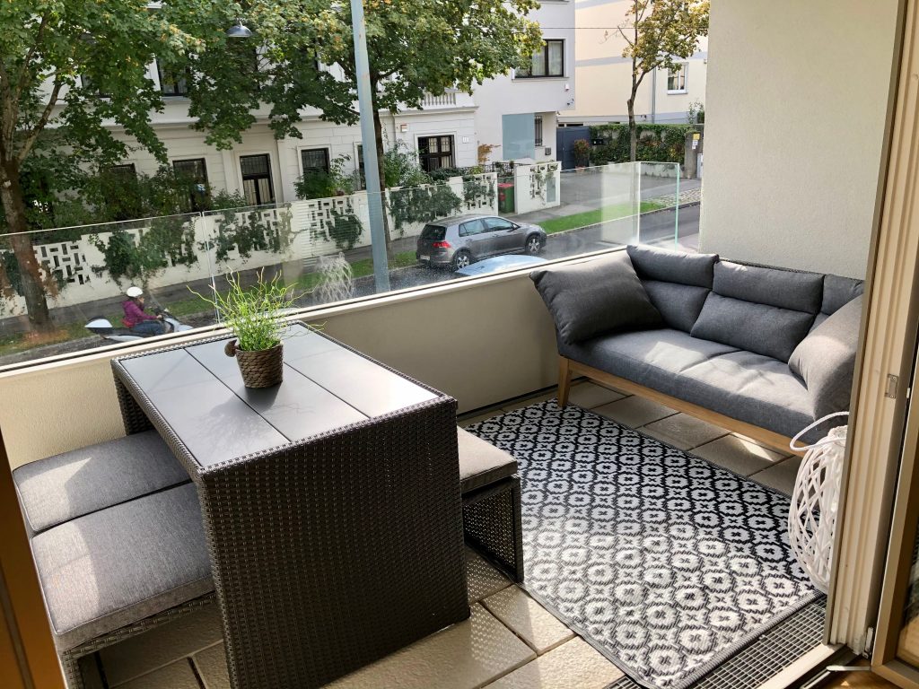 At some point, maybe I’ll do another post to share more photos of our apartment but for now, snippets here and there will do. We are not downtown, which really bothered us when we first got our housing assignment but having settled in, we LOVE it here. We enjoy easy access to downtown and more space and amenities because we aren’t smack in the middle of the city. The space is larger than our last couple places so we’ve enjoyed buying a few new items to fill things out…like a new area rug, little bar cart, a runner for our freakishly long hallway, and furnishing our favorite part of the whole house – the balcony. It’s very cozy now and I think Jeff plans to move out there permanently…
